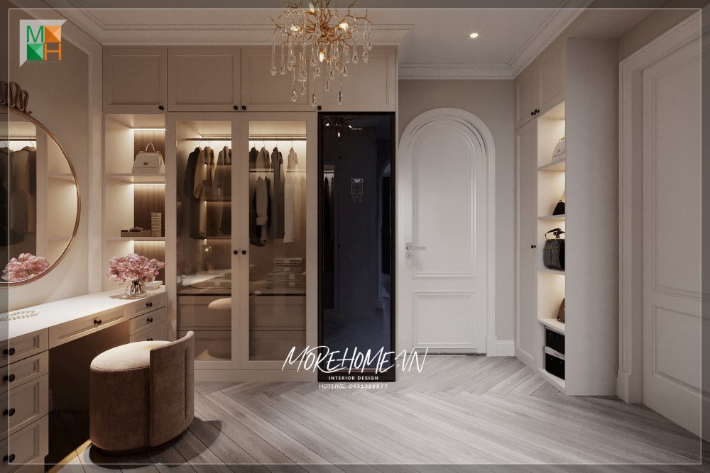 Phòng ngủ Master được trang bị nội thất gỗ tự nhiên sang trọng, với vách tường đầu giường được trang trí bằng tranh dán tường họa tiết hoa tạo nên một điểm nhấn ấn tượng cho cả căn phòng.